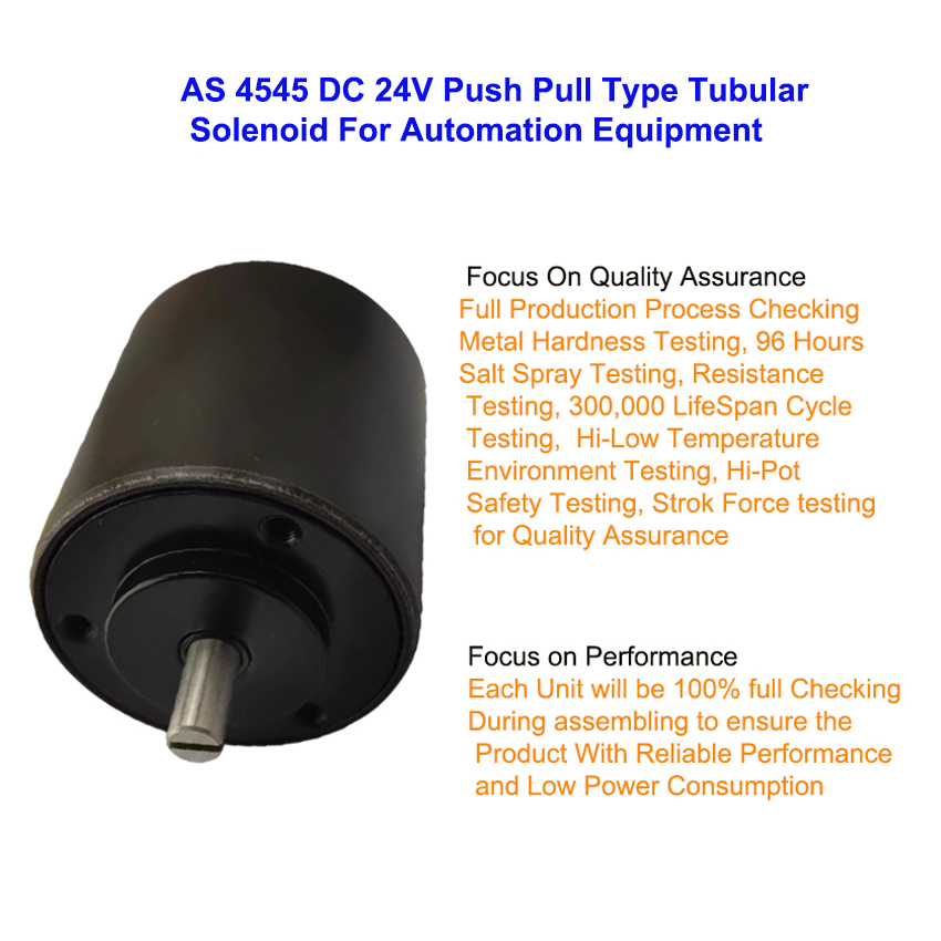 The AS 4545 is a DC 24V push‑pull tubular solenoid designed for reliable automation equipment applications. It provides stable linear actuation, fast response, low power consumption and long working life. With a rugged tubular structure, it ensures consistent push‑pull performance under continuous operation. This solenoid is widely applied in automated machinery, industrial control systems, valves, door locks and various actuation devices. It offers stable performance, high durability and easy installation, making it an ideal choice for manufacturers and engineers looking for a dependable and cost‑effective solenoid solution for automation and industrial equipment.
