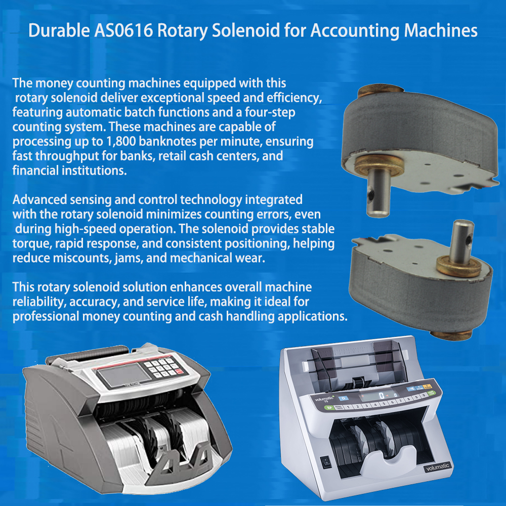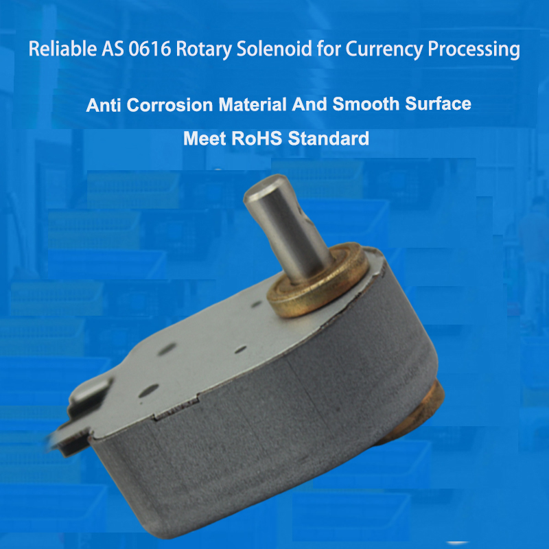 The AS 0616 rotary solenoid finds primary application in money accounting machines, currency counters, note sorting systems, and banking automation equipment. It facilitates precise angular motion, which is essential for functions like locking, releasing, positioning, and diverting banknotes.